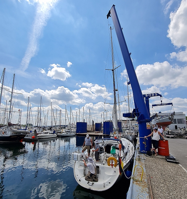 Mast stellen Freitag, Aufriggen und Probesegeln / Einsegeln am Samstag und putzen am Sonntag. Samstag und Sonntag haben Tom, Arndt, Claudia, Nico und ich die Naviga segelfertig gemacht. Da wir tags zuvor den Mast gestellt hatten, mussten wir auch mal auf beide Backen …