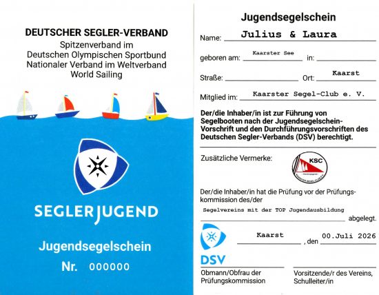 | Zertifikat: | Jugendsegelschein des Deutschen Seglerverbandes e. V. |