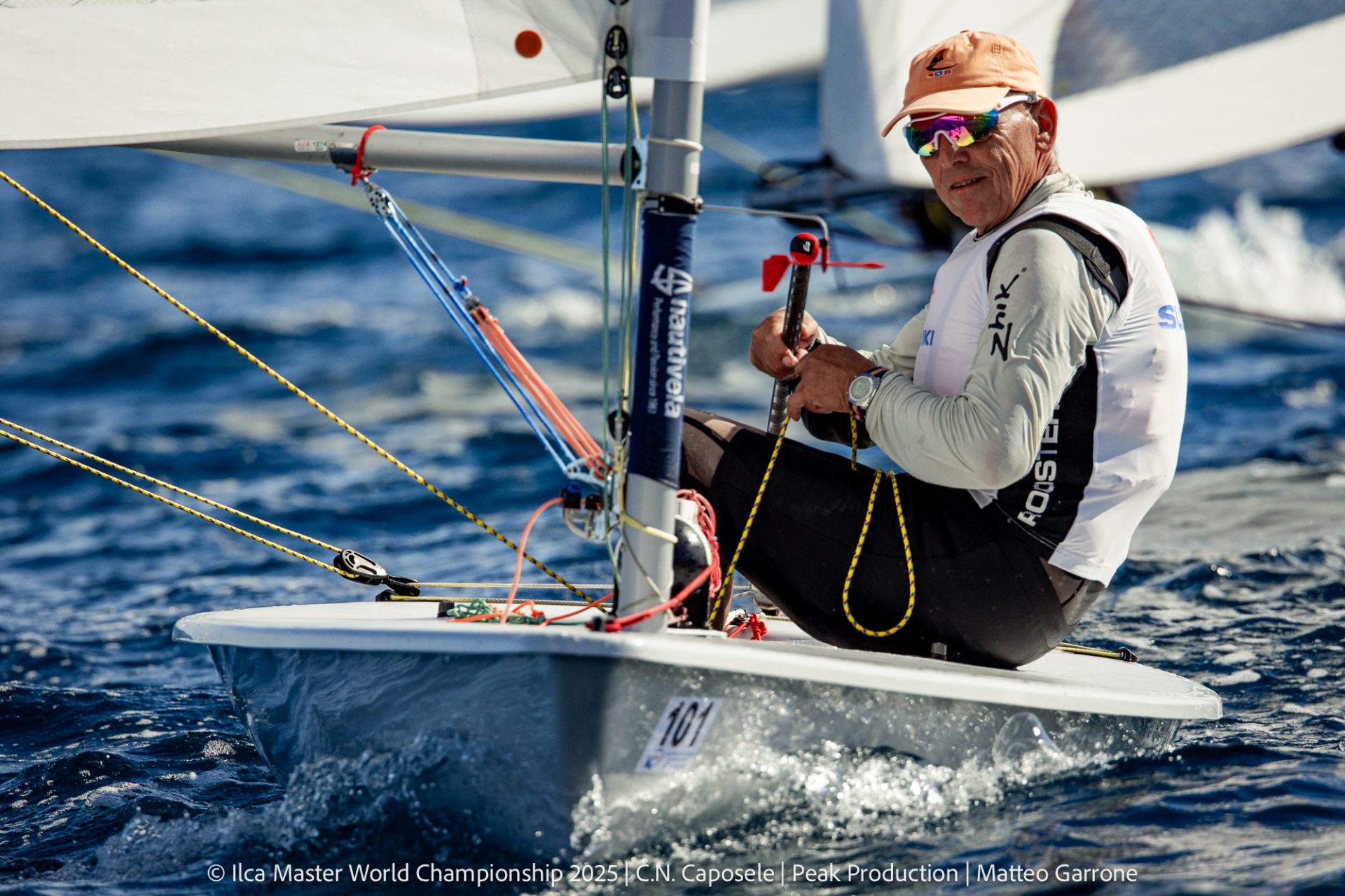 Die Italiener boten abseits des Wassers ein tolles Programm mit einer Eröffnungs- und Schlussfeier, die ich bisher noch nicht erlebt habe. Das ins Wasser kommen auf 7 Rampen war meist innerhalb von 70 – 80 Minuten geschafft, Abends beim ausslippen war das Gedränge meist wild, da ich mein Boot nicht verschandeln wollte, habe ich immer gewartet, bis der Ansturm vorbei war. Auf dem Wasser waren die Teilnehmer auf 3 Bahnen mit jeweils ca 150 Booten aufgeteilt, was super funktioniert hat. Die Bedingungen waren herausfordernd, da wir gegen 12 Uhr ausgelaufen sind, meist erst ab 15 Uhr mit einsetzender Seebrise segeln konnten. Für die 10 bis 12 Läufe (nicht jede Startgruppe konnten windbedingt alle 12 Rennen segeln) haben wir an 7 Tagen fast 40 Stunden auf dem Wasser verbracht. In meiner Klasse (Laser Standard ab 65 Jahre) waren 44 Teilnehmer am Start, darunter alle Weltmeister und viele Podiumssegler der letzten WM’s, Olympiasieger und -teilnehmer. Also richtig großes Kino.